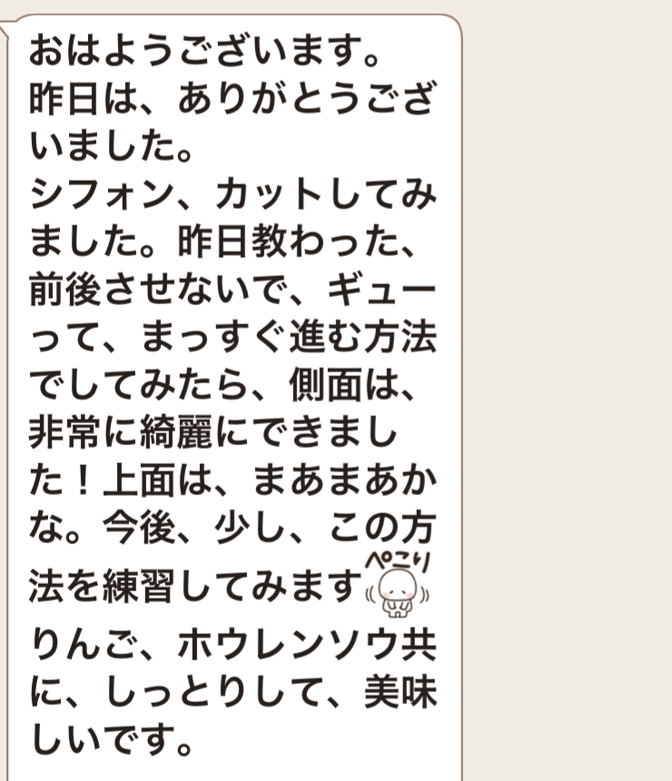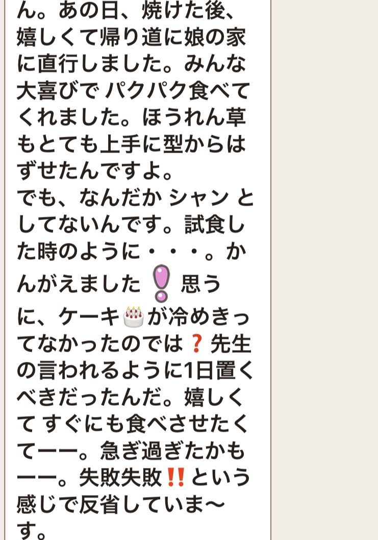 シフォンケーキを作ったことがなかった生徒さんが、今やシフォンケーキの奥深さに
