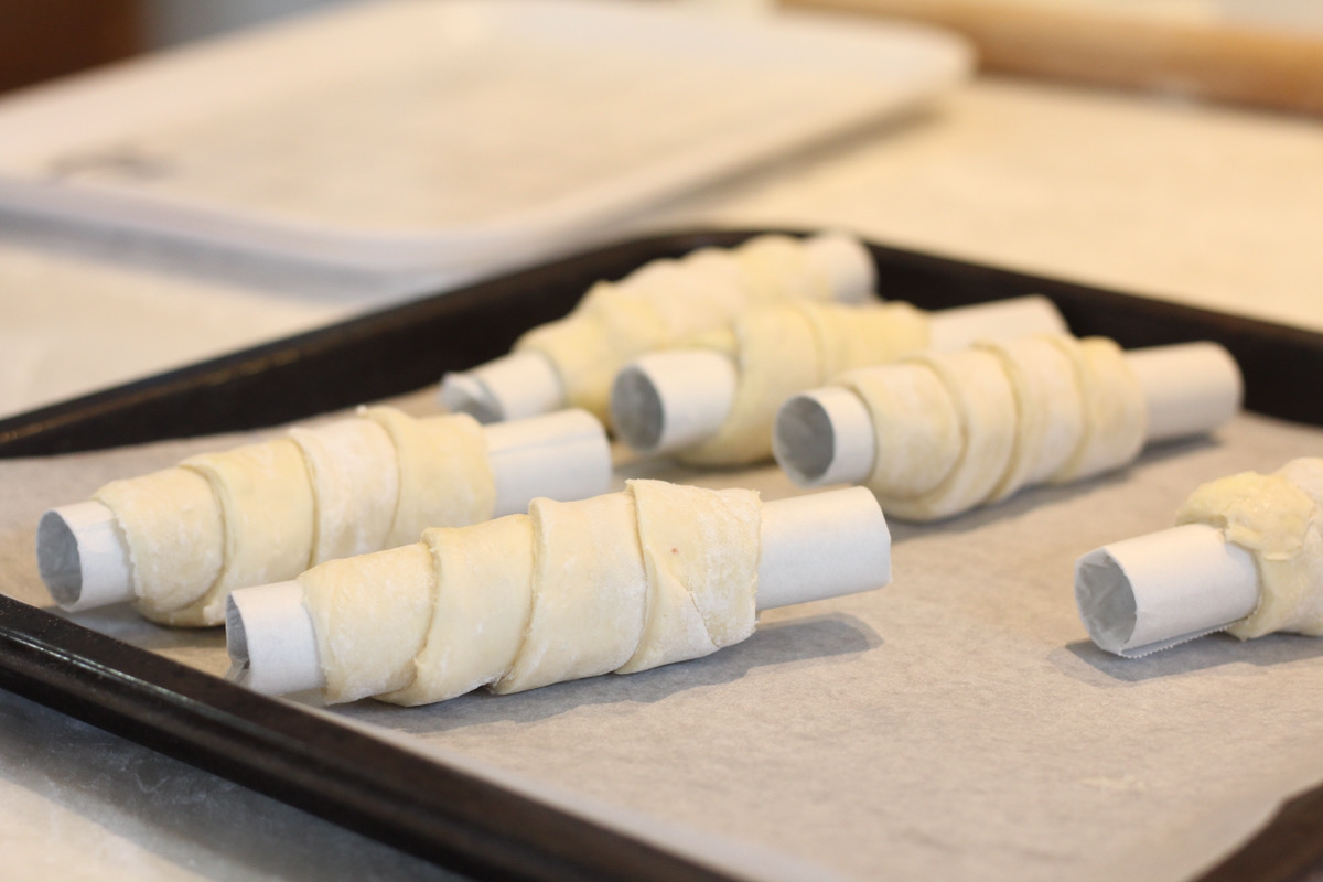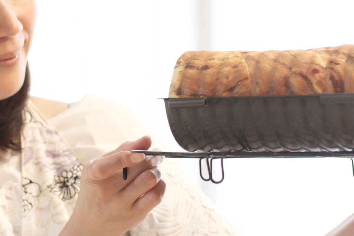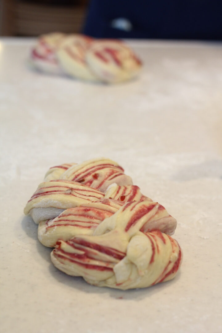 クローネは、生地にバターを折り込み、ラウンドパンは自作のイチゴシートを生地に折り込みます。