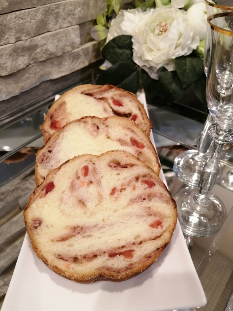 今か、今か…と粉雪からパンを持って帰るのを楽しみにしていた夫と一緒に食べてみました? 以下、夫の感想です。 クローネは抜群のサクサク感とバターの香ばしさが最高! しっかり甘さのあるカスタードクリームは口当たりが軽く、バター香る生地との相性は自分が知る中では1番!! との事です?? かなり美食家の夫ですが… 粉雪のパンは生地と具材のバランスセンスが抜群みたいです? いちごラウンドはイチゴの香りとピンクの見た目が可愛いすぎます? もちろん美味しすぎて…夫がいちごラウンド一本食べてしまいました…??? ふふっ?? 一本食べてしまうなんて…、本当にビックリですよね? 家族全員、暫くパンやケーキ?を食べられなかったので、夫が 「久しぶりのパン食解禁は、やっぱり粉雪がいいな〜」と言っていたんです? だから久々のパン食、しかも粉雪のパン?という事で夫のテンションが上がってしまった様です? 美味しな〜、うん。バランスが…△✕□▲☆…、と一人ブツブツ言いながら嬉しそうに食べてしまいました…?? あっ?? 2本作ったイチゴラウンド、驚く事に夫はちゃんと違いが分かっていました?? クリームチーズは、香りも味もまさにイチゴヨーグルト?でした??? クリームチーズもいいですね? なおこ先生、本当にありがとうございます☺️ この20年、たくさんのパン教室やお菓子教室、料理教室に通いましたが、パンはなおこ先生の粉雪レッスンがダントツで美味しいです???? 我が家の美食家の家族が大絶賛するほどですから? ↑↑↑いちごのラウンドパンを素敵に送ってきてくださいました。