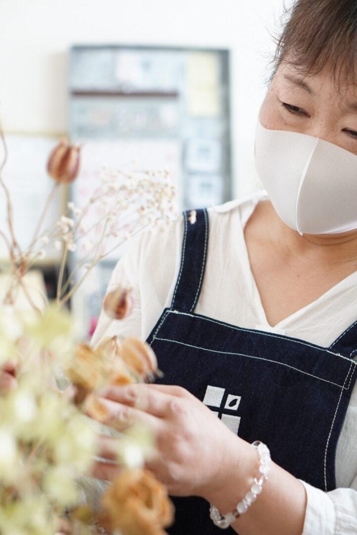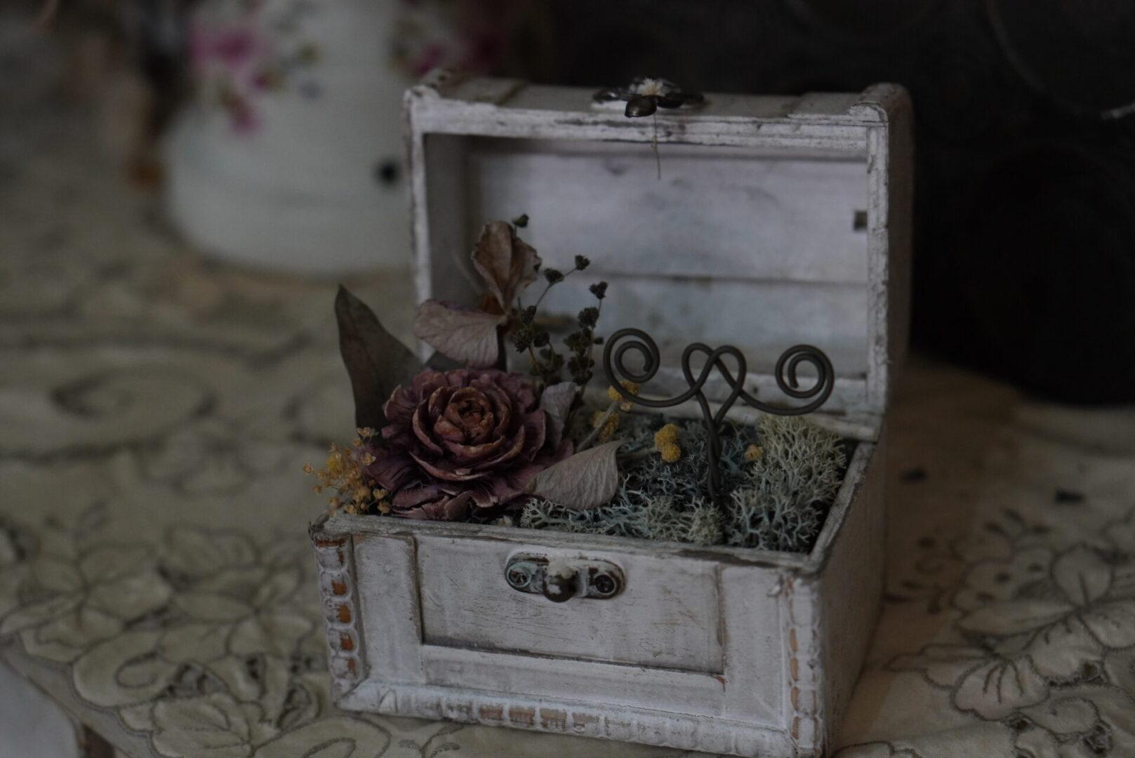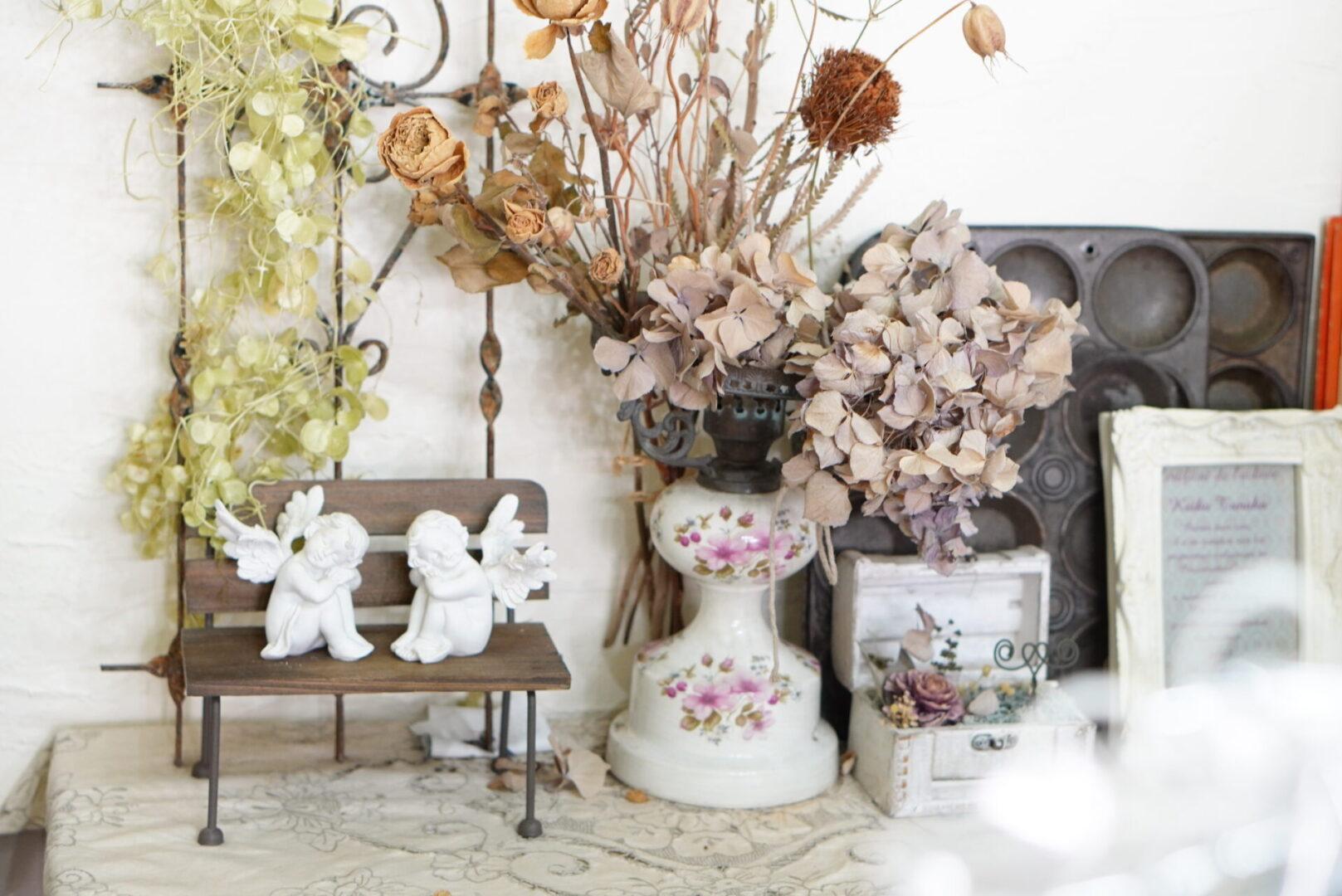 過去、ご自身が趣味で作ったトールペイントやワイヤーアート、アンティークフラワーやガラス細工、ミシンや縫物、ドライフラワーやペイント、アトリエの壁もすべて一人でペイントされたという多才な方。