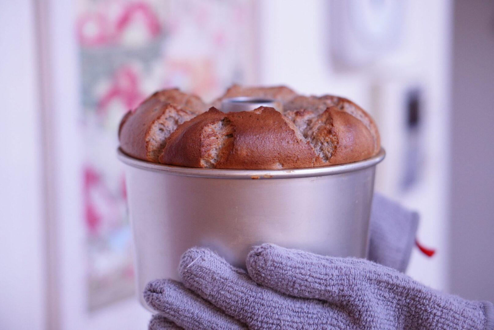 3回目に焼かれた生徒さんのシフォンケーキが、ちょっと犠牲になることが判明しました。
