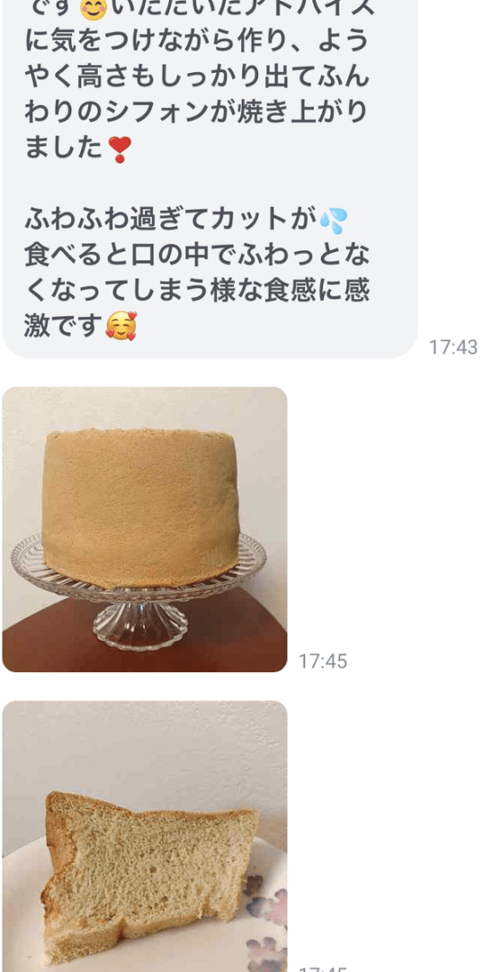 今回は東京方面の方の、小麦粉シフォンもお得意な生徒さんをご紹介いたしましたが、これからもオンライン上で頑張っている生徒さんの成長のご様子などをご紹介させていただき、皆さんの後押しや、励みになればいいな、