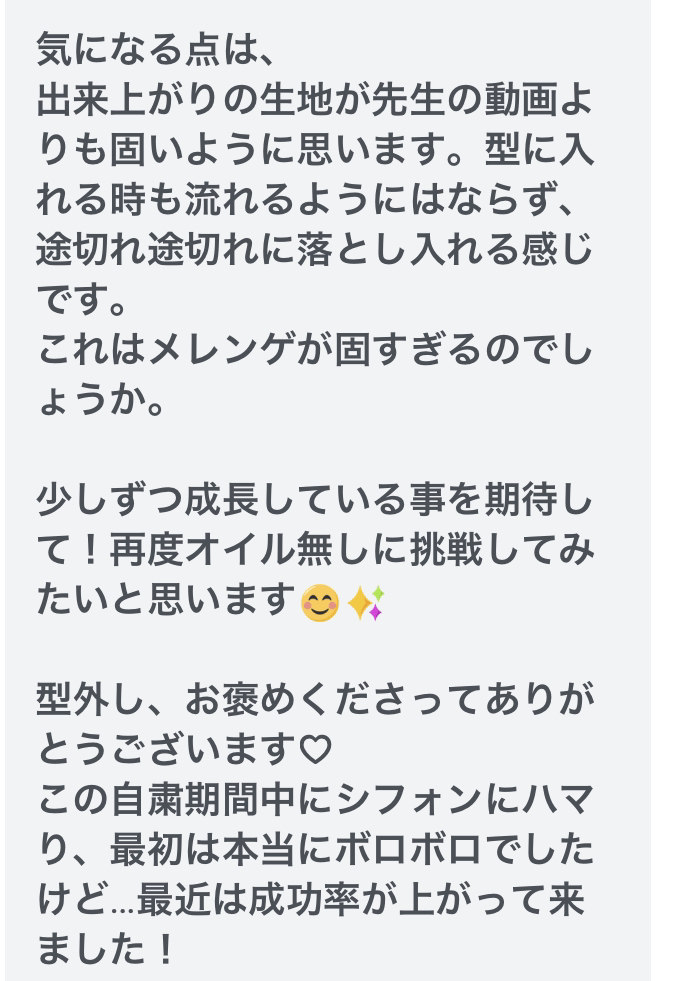 と叫んでしまいましたが、生徒さんは元々、シフォンケーキ作りが大好きで、柔らかめのシフォンケーキにもすぐ、臨機応変に対応出来られたのだとも思います。