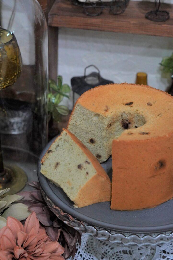 どうでしょう、アンティークをバックにしたシフォンケーキ、いい感じでしょう?
