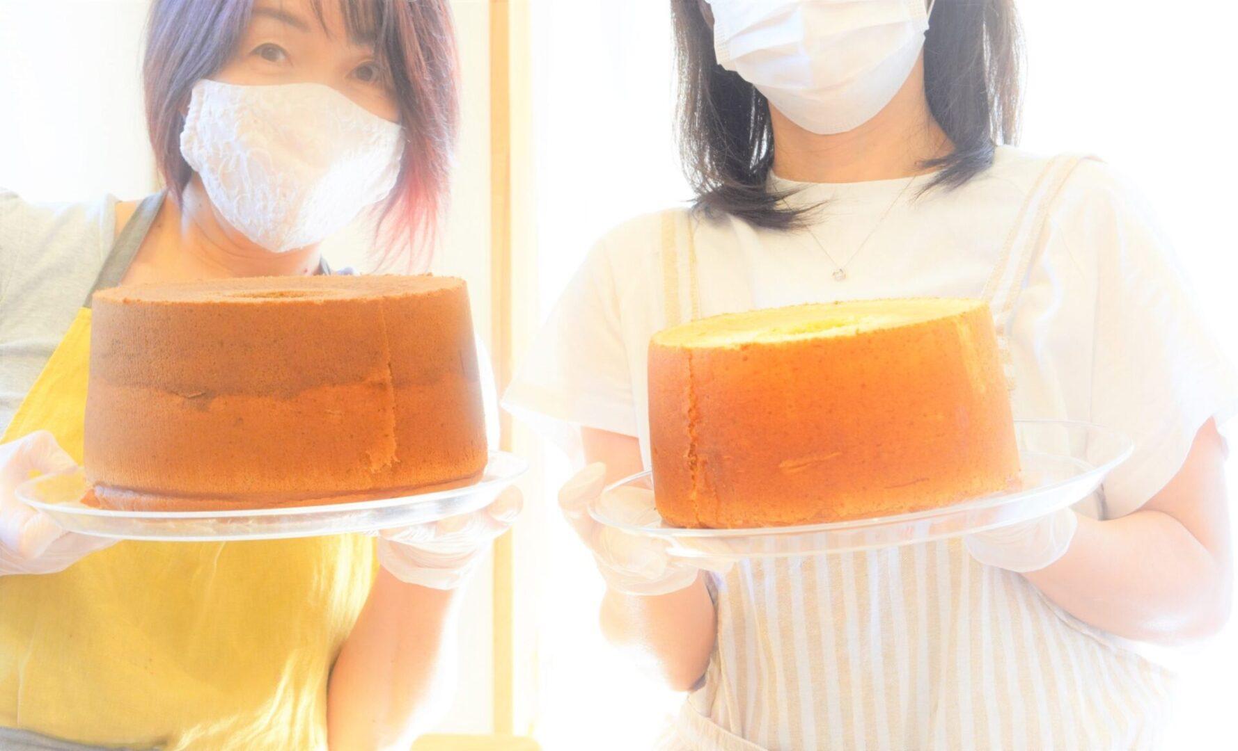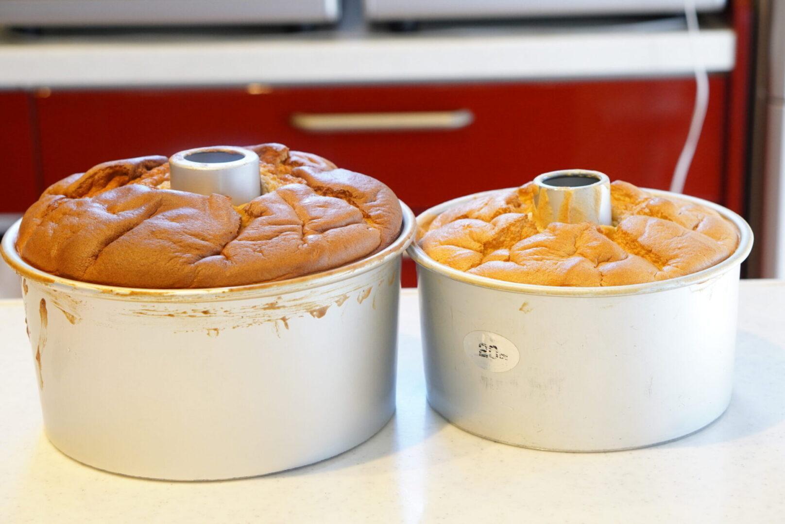 私が焼いた23㎝シフォン型と、生徒さんが焼いた20㎝型を並べて遊んでみました。