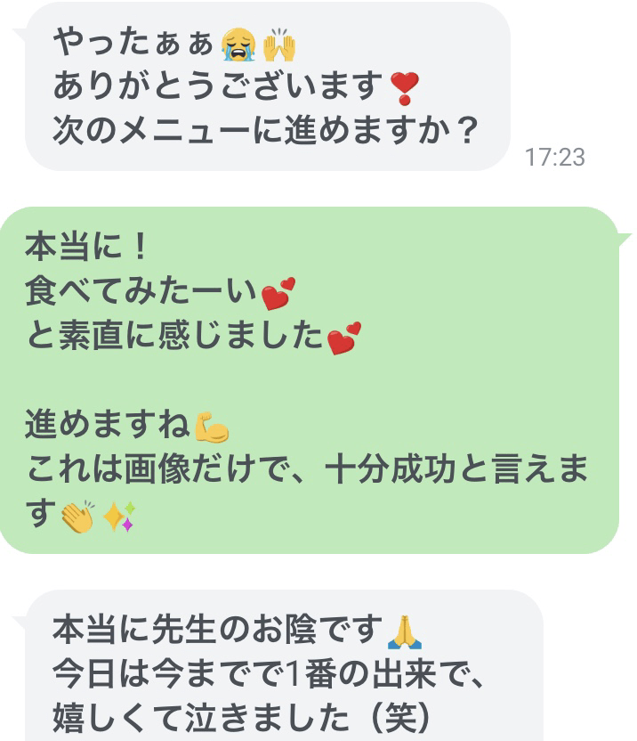 でも、オンライン動画があったり、質問するたびに付いて来るポイントを押さえるだけで、他のレシピへ逃げていかず、諦めない気持ちがあれば、必ず成長します。