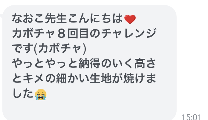 それまで作っておられたシフォンケーキとはとがって、柔らかさにカルチャーショックを受けられていましたが、味がとってもおいしい事から、何としても上手く焼けるようになりたいという信念のもと、本当によく頑張って下さいました。