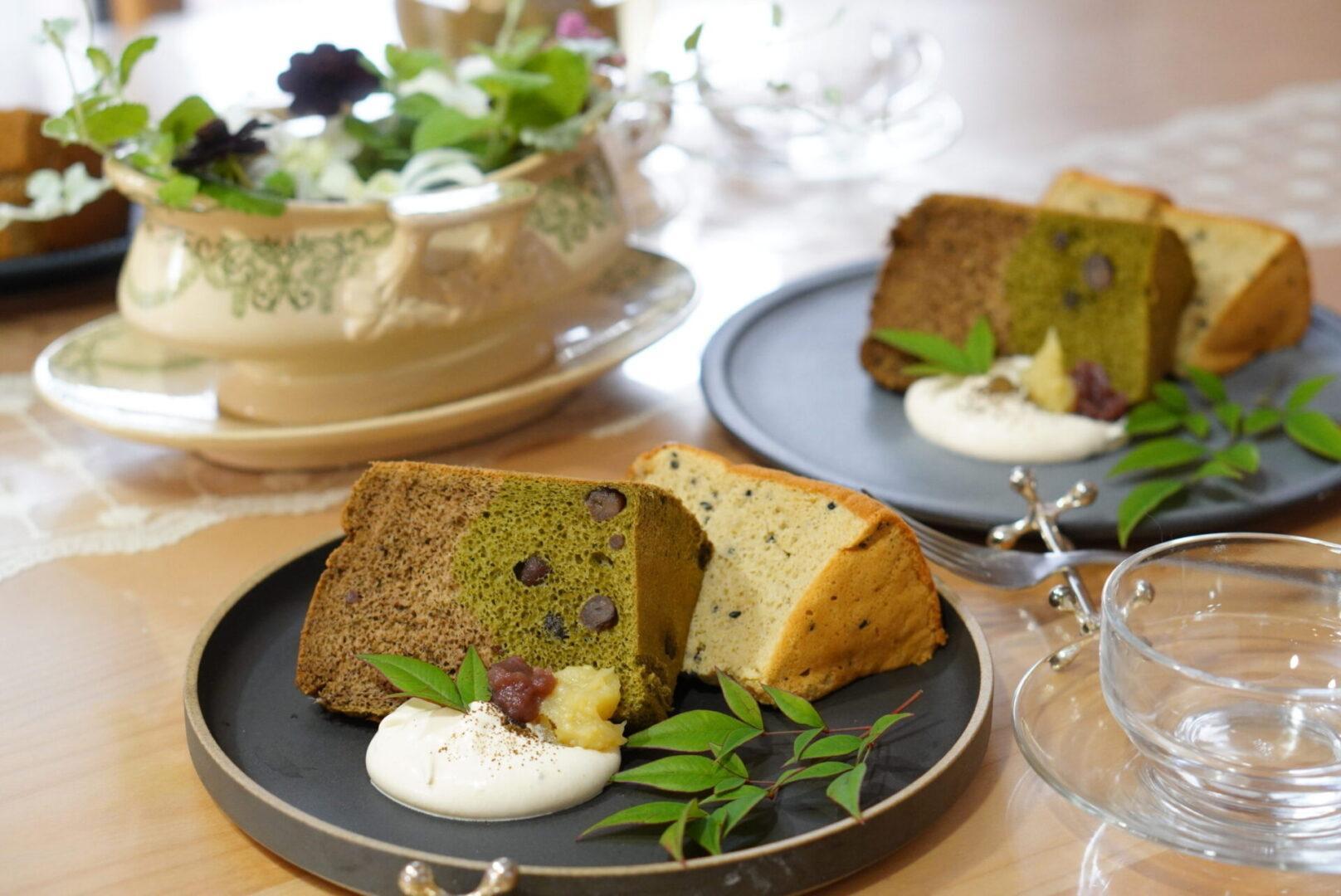 まずは粉雪シフォンベテランさんによる、ちょっぴりハードなメニューである濃厚抹茶と濃厚ほうじ茶のシフォンケーキ。
