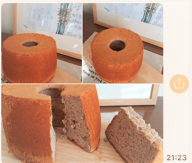 粉雪シフォンでは、ここで作ったシフォンケーキは、レッスンシフォンなので、お持ち帰りいただいて型外しをして頂いた後も、極力画像を提供して頂き、ご感想を伺います。