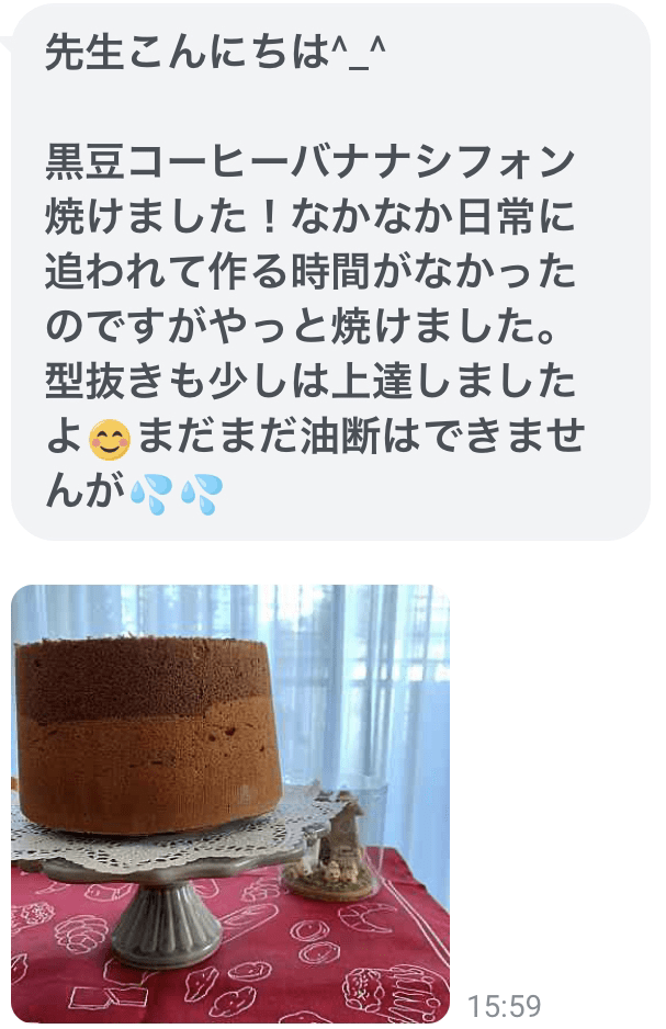 2層のシフォン、初挑戦だったのでドキドキワクワクしながら作りました?2層が崩れるのが怖くて恐る恐るでした? 明日またチャレンジしてみます。リアルレッスン、私にとってとても重要でした。 リアルがあったからお家でも新しいメニューにチャレンジできるなぁと思っています。 コツを掴むのに時間がかかるんです?型抜きも、表面は大分自信がつきましたが筒の中側はまだまだです? 引き続き頑張りまーす?
