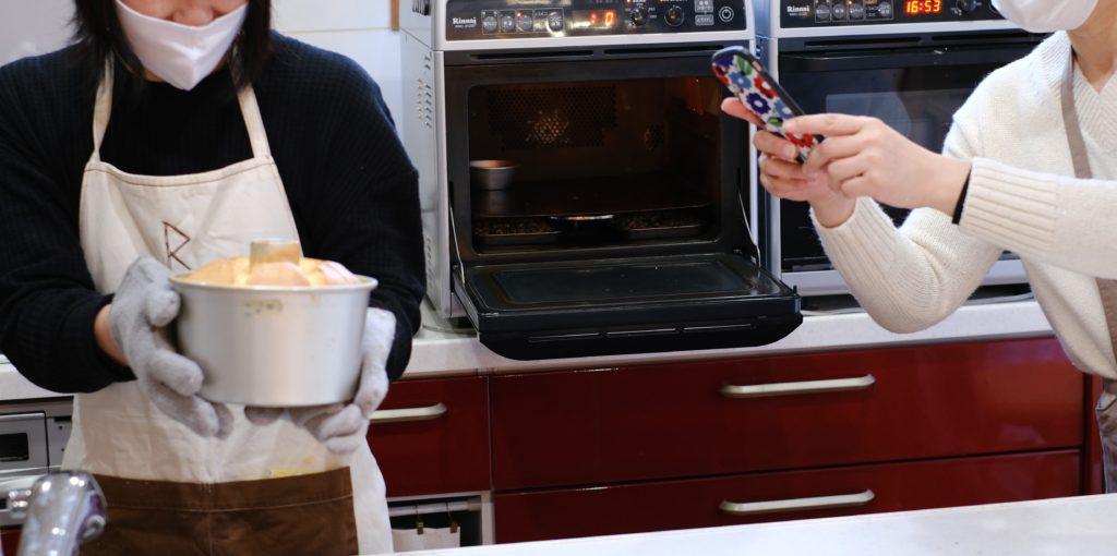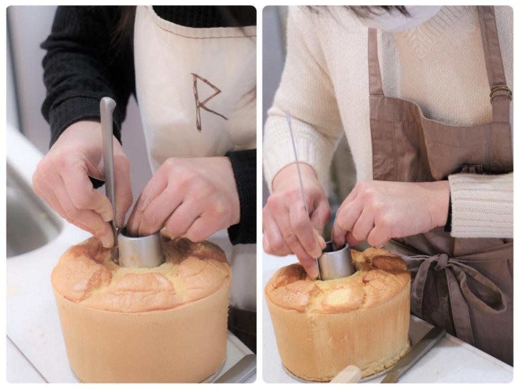 講師の試作シフォンを、講師→お姉さん→妹さん、と順番に型外ししたのですが、見事綺麗に抜くことが出来ました!