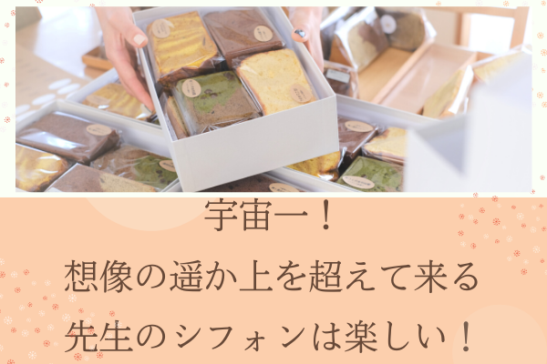 先生のシフォンに出会い、シフォン一本でもやっていける腕を身に付けたいと思いました。でも、一番は、今まで食べたことのないシフォンに驚いたことと、この味、食感はみんなに食べてもらいたい!と思ったからです。