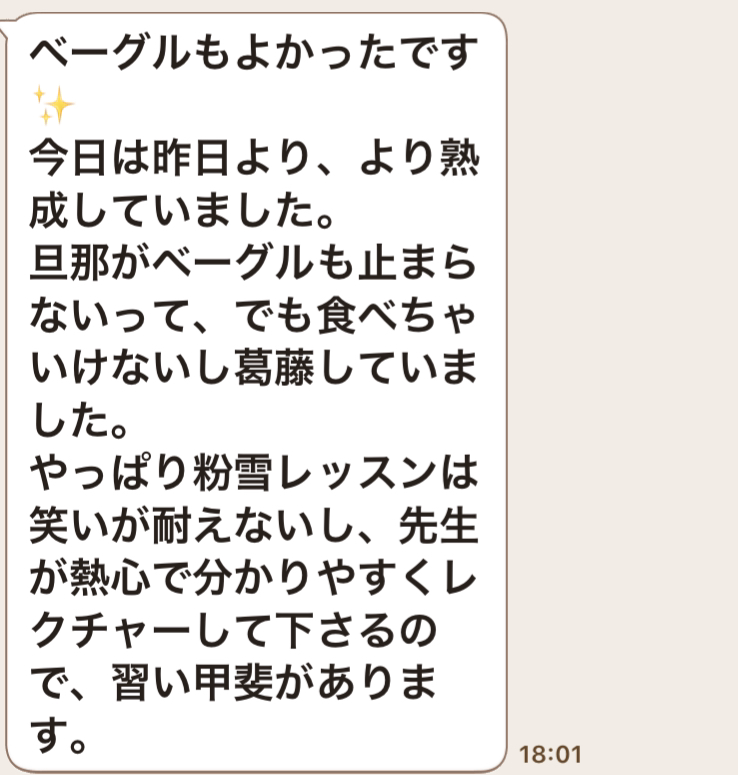 ご家族との会話や雰囲気が、粉雪の教室から持ちかえった美味しいもので素敵に広がっていると思うと、なんともいえない幸福感に浸ってしまう私でした♡