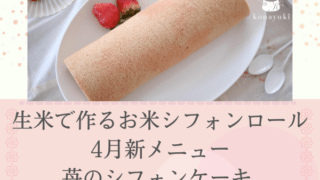生米シフォンメニュー開発中 生米で作るお米シフォンロール 4月新メニュー 苺のシフォンケーキ フレッシュ苺のストロベリーガーデンロール 粉雪シフォン